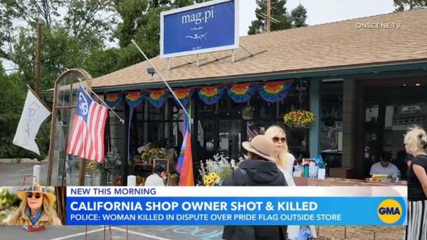 据加州官员报道,一名男子在一名66岁的女子商店的骄傲旗帜上开枪打死了她,随后被警方击毙。