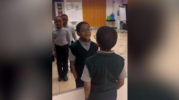 一个又一个男孩走到镜子前。有些人很自信,有些人看起来很害羞,还有很多人在做一个简单的自爱行为时咧着嘴笑:对着镜子说他们最喜欢自己的什么。