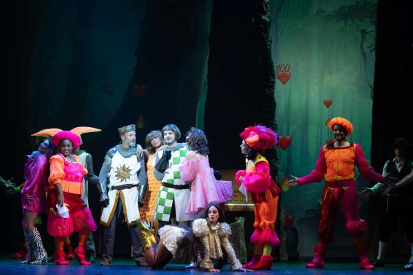 在舞台上,大约20名男女演员唱歌(也现场表演)、跳舞,有时还扮演几个不同的角色。这个剧团会让你微笑、大笑,有时还会爆发出来,他们专注于用精确的交流和手势完成的集体作品。这一点在影片中引人注目的场景中表现得很明显:由劳伦·范·肯彭饰演的湖女(Lady of the Lake)的到来,她在各种各样的音乐风格中游移自如;以美式啦啦队比赛的方式给予亚瑟鼓励;即兴喜剧式的骑士抬腿芭蕾。在对话中,亚瑟、兰斯洛特和加拉哈德与各种各样的角色有过无数次的接触,包括说“Ni!”的神秘骑士或栖息在秋千上的魔法师。