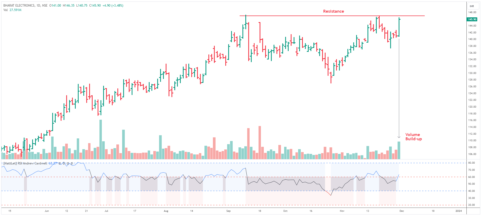 巴拉特电子(BEL)的股票在每日规模上处于水平趋势线突破的边缘。周四,该股成交量是其50日平均成交量的两倍多。这显示了实际突破发生之前的积累。此外,该股在每日规模上形成了一个相当大的看涨蜡烛。