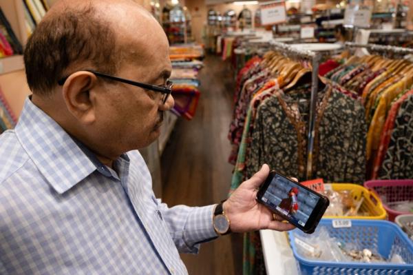2024年6月7日,在纽约市杰克逊高地附近,商店经理鲁普·萨纳尼在手机上观看板球比赛。(图片来源:Elza Goffaux /法新社)