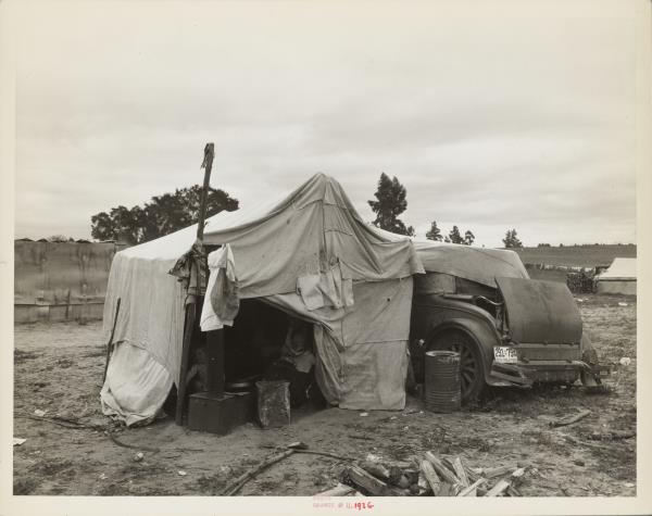 那些进入加州的人经常发现自己不断地从一个农场搬到另一个农场,寻找工作。根据美国国家档案馆的资料,在联邦政府开始建立移民营地以容纳他们之前,他们住在农业种植者提供的简陋住所或蹲在城镇郊区的“胡佛村”棚户区。