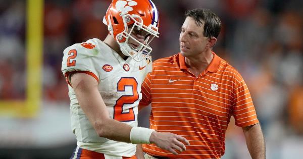 周一,在老虎队尴尬地输给杜克大学的大学橄榄球比赛中,克莱姆森队的四分卫凯德·克鲁布尼克走过教练达博·斯温尼伸出的手,这促使教练回头看了看他的球员。