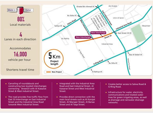新的立交被认为是一个重要的连接,对于那些来自多哈方向的西工业街,或来自Salwa路的Bu Sidra立交,或来自G-Ring路的Bu Silla立交,通过33街向工业区方向,反之亦然,为该地区许多重要的商业和工业设施提供服务,特别是因为西工业街延伸在Salwa路和G-Ring路之间。新的立交还将便利通往Al Taqa街方向的交通,该街道还连接Al Sailiyya立交处的Salwa路和Al Bahiya立交处的F环路。
