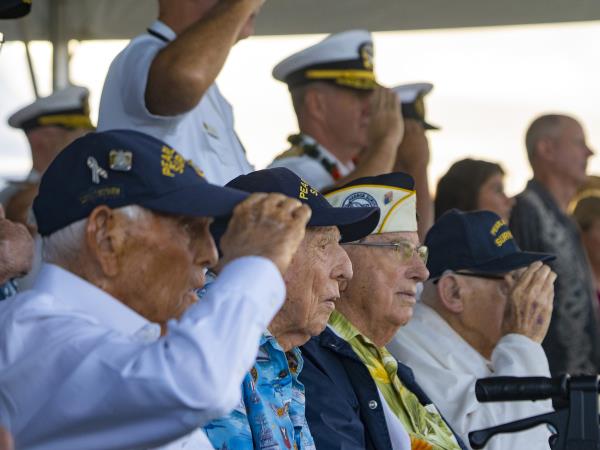 2023年12月7日星期四,在夏威夷檀香山珍珠港举行的第82届珍珠港纪念日仪式上,珍珠港幸存者哈里·钱德勒、肯·史蒂文斯、赫伯·埃尔弗林和艾拉·“艾克”·沙布在国歌奏响时敬礼。