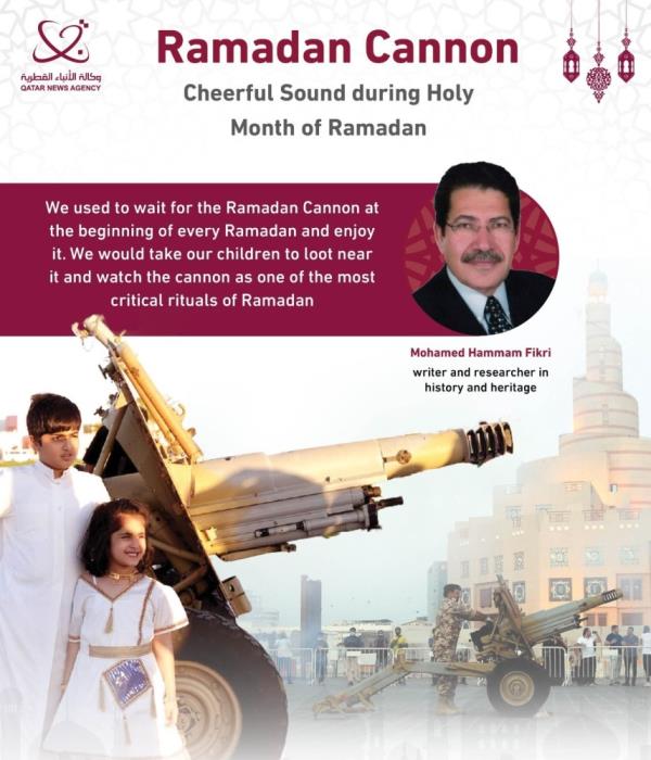 历史和遗产作家兼研究员穆罕默德·哈曼·菲克里在接受卡塔尔通讯社(QNA)采访时表示,斋月是神圣的月份,也有良好的习俗和传统,这些习俗和传统在整个月里都在培养这些特征,比如埃及自马穆鲁克时代以来的著名传统。他补充说,最著名的说法表明,大炮是偶然发现的,因为有一门新的大炮即将在日落时进行测试,以便提醒所有听到声音的人,该吃早餐了。