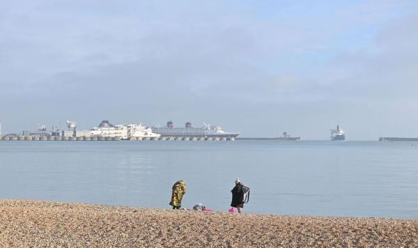 尽管被夹在两个航运码头之间,看不到一粒沙子,但在8月的酷热中,多佛海滩还是挤满了人。