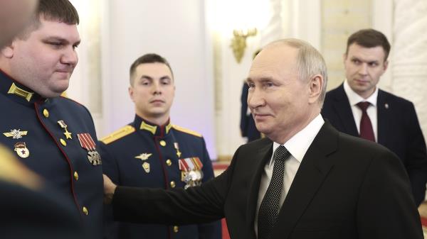 周五,俄罗斯总统普京在莫斯科克里姆林宫与获得勋章的俄罗斯军人交谈。