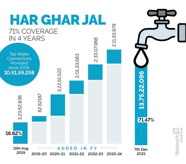 根据前Jal Shakti州部长Prahlad Patel的说法,九个邦和联邦领土已经成功地向所有农村家庭提供自来水供应,即100%覆盖。这些国家包括古吉拉特邦、果阿邦、哈里亚纳邦、喜马偕尔邦、旁遮普邦、特伦甘纳邦、安达曼和尼科巴群岛、达德拉纳加尔、哈韦利和达曼迪乌以及普杜切里。Har Ghar Jal任务的预算支出为3.6万亿卢比,其影响具有变革性,目标雄心勃勃。