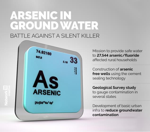 砷污染的水会导致皮肤癌、肺癌、肾癌和膀胱癌。经过处理的自来水的供应已经能够在很大程度上减轻这些有害化学物质的风险。水是国家的问题,地下水管理的主要责任在于各州政府。然而,中心已作出广泛努力,帮助他们与这一沉默的杀手作斗争。