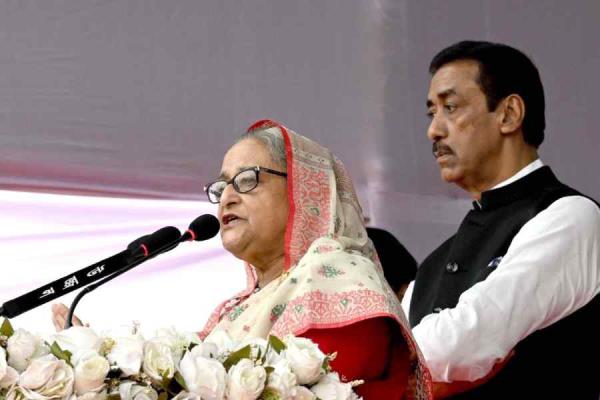 孟加拉国总理兼人民联盟主席谢赫·哈西娜周四在纳拉扬甘杰的选举集会上发表讲话。图片来源:人民联盟