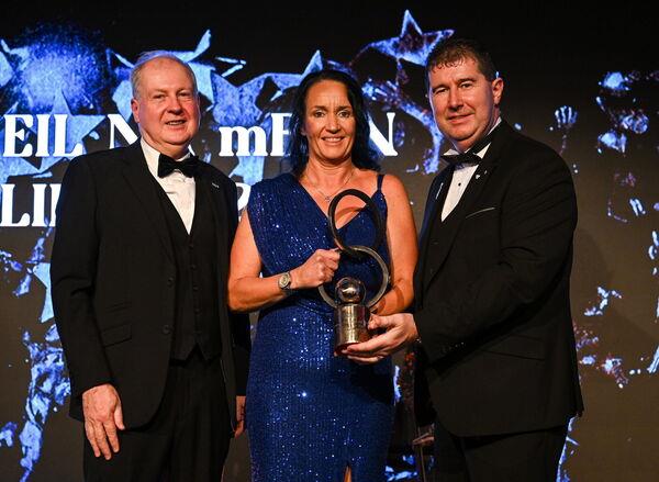都柏林的克里斯蒂娜·麦金蒂(Christina McGinty)由Ard Stiúrthóir TG4艾伦·埃斯蒙特(左)和Uachtarán库曼·皮尔·盖尔娜·诺顿(Mícheál Naughtonl)颁发了她的名人堂奖。