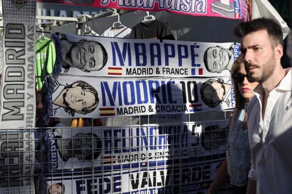 庆祝活动开始前,法国足球运动员姆巴佩、克罗地亚球员莫德里奇和英国球员贝林根的足球围巾在马德里圣地亚哥伯纳乌球场外的街头摊贩摊位上展示2024年6月1日,多特蒙德对阵皇家马德里的欧洲冠军联赛决赛在伦敦举行。图片来源:Thomas COEX /法新社