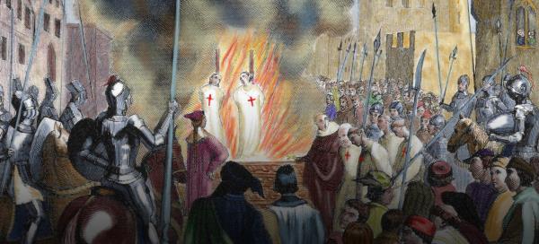 但在1314年,终身监禁对国王菲利普四世来说还不够严厉。当他听到德莫莱的抗议时,他下令当晚将他和他的同胞一起烧死。