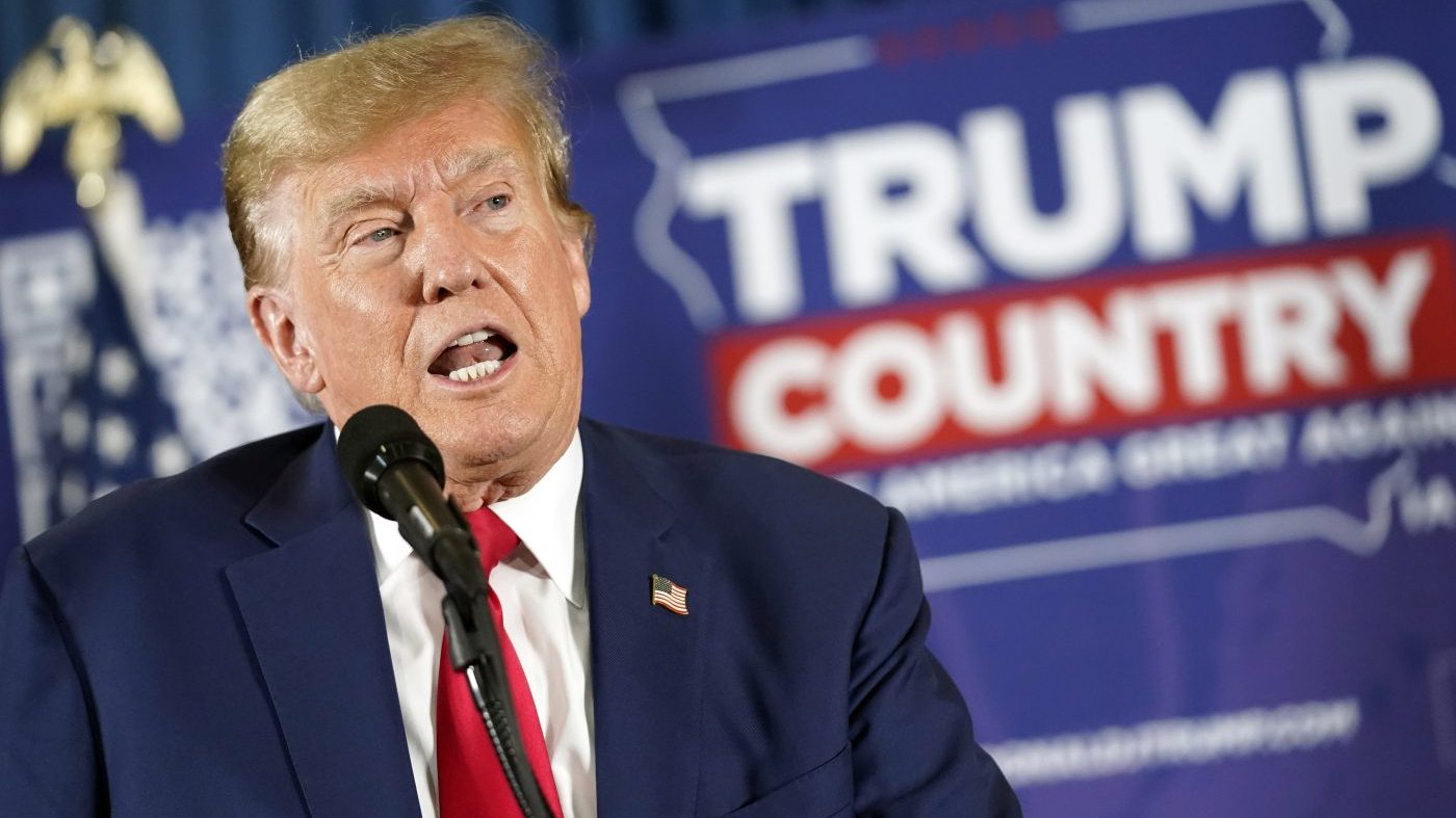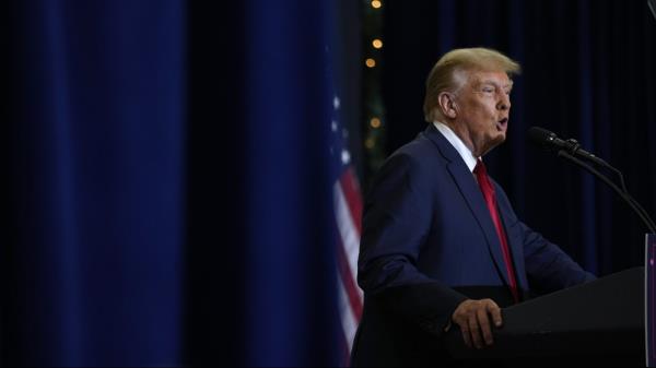 2023年12月19日,星期二,在爱荷华州滑铁卢,前总统特朗普在承诺党团集会上发表讲话。(美联社图片/Charlie Neibergall)