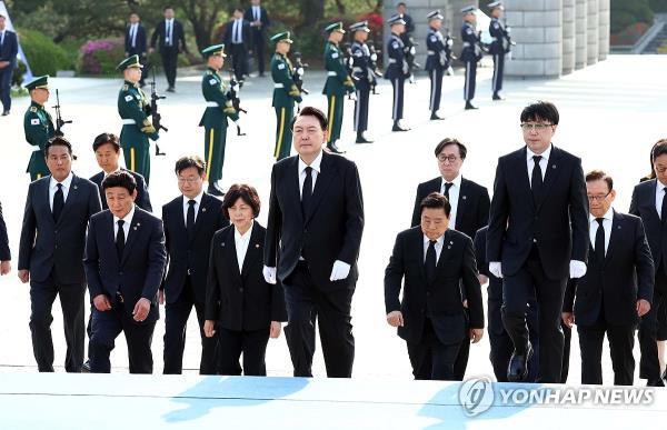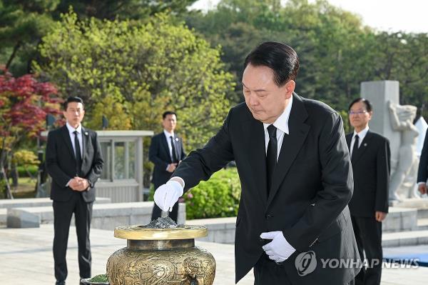 尹光雄参拜了位于首尔北部的国立4·19墓地,那里埋葬着在起义中丧生的186人的遗体,他在纪念碑前献花并焚香。