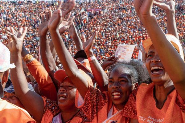 这位即将卸任的总统星期天在塔那那利佛举行了他的最后一次竞选集会,数千名狂热的群众穿着印有他形象的t恤。