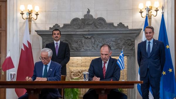 阿米尔殿下和希腊总理阁下见证了卡塔尔国外交部与希腊共和国外交部之间关于就共同关心的问题进行政治协商的谅解备忘录的签署,以及卡塔尔国国防部与希腊国防部之间关于军事合作的协定的签署。