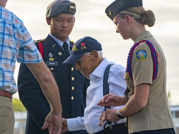 102岁的哈里·钱德勒(Harry Chandler)回忆起1941年在珍珠港上方山丘上的艾亚高地(Aiea Heights)的一家流动医院升起国旗的情景。他当时是海军医院的三等医护兵。