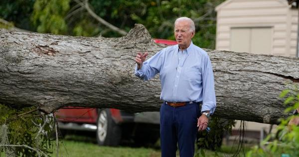 President Joe Biden surveys damage caused by Hurricane Idalia, Saturday, Sept. 2, 2023, in Live Oak, Fla. (AP Photo/Julio Cortez)