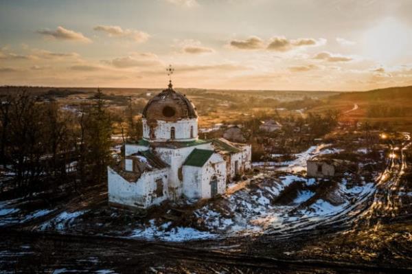 2023年2月22日,在俄罗斯军事入侵乌克兰期间,哈尔科夫地区Mala Komyshuvakha村,这张航拍照片显示了一座被俄罗斯军队用作临时医院的受损教堂。法新社