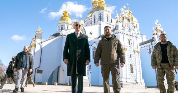President Joe Biden, left, walks with Ukrainian President Volodymyr Zelenskyy at St. Michaels Golden-Domed Cathedral during an unannounced visit, in Kyiv, Ukraine, on Feb. 20.